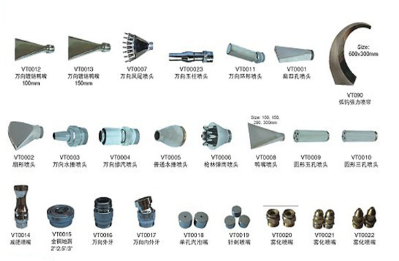 萬向鳳尾噴頭、萬向玉柱噴頭、萬向環(huán)形噴頭、弧鉤強力噴簾、扇形噴頭、萬向水錘噴頭、槍林彈雨、鴨嘴噴頭等等。